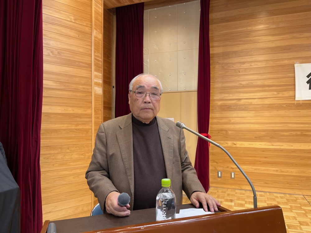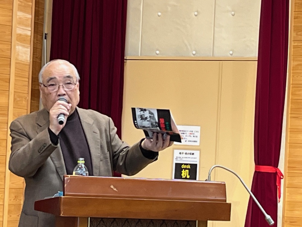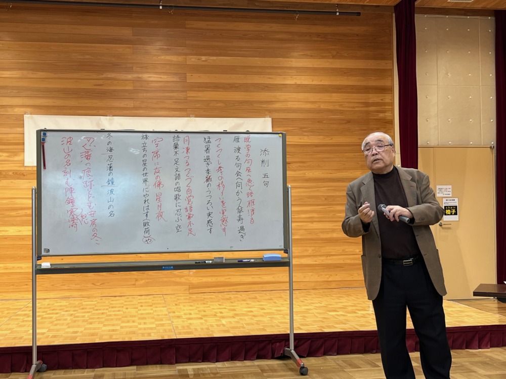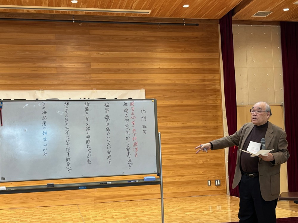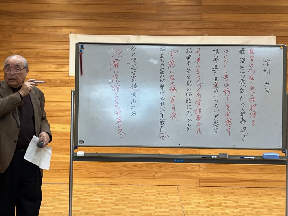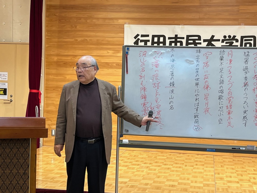 行田市民大学同窓会 講演会「私心のない活動は人を動かす」が、講師に三沢 一水先生を迎え2023年11月29日(水)に忍・行田公民館ホールで開催されました。前半の50分は郷土史研究家、文化活動家である三沢一水先生の半世紀の活動史を語っていただく講演「私心のない活動は人を動かす」、そして後半の50分は初心者に向けた俳句講座「俳句の基礎、行田の俳人・歴史、添削指導5句」でした。              *写真をクリックすると拡大します。
