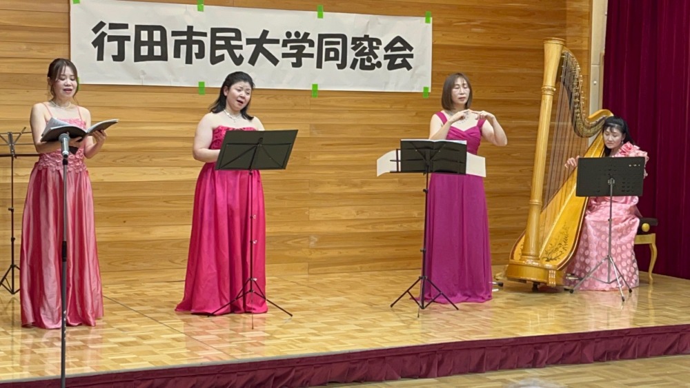 コンサート ハープ、ピアノ、ソプラノ歌手で素敵なハーモニーを奏でる5人グループの「ぴあのしも」の皆さんのミニコンサートでした。春を迎えた今の時期にぴったりの「朧月夜」「花」から始まり「野に咲く花にように」「みかんの花咲く丘」、中頃には同窓生と一緒になって手話を交えて「春が来た」「鬼のパンツ」の合唱で盛り上がり、「津軽海峡冬景色」「川の流れのように」「糸」「翼をください」「you raise me up」と、あっという間にお開きの時間となってしまいました。