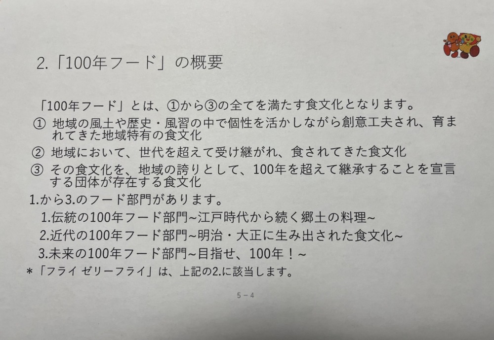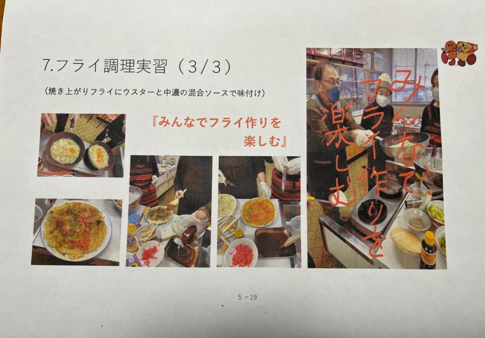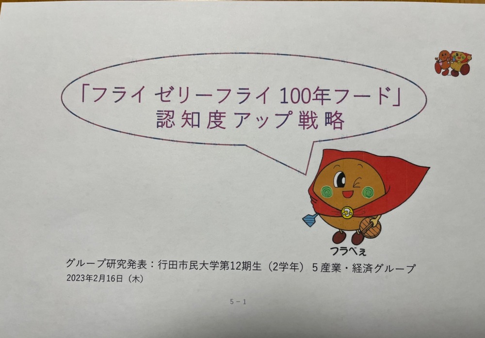 講 演 同窓生 田島 実様(行田市民大学第12期生)が5産業・経済グループの2学年グループ研究発表「フライ ゼリーフライ 100年フード」認知度アップ戦略を、つづいてグループ研究仲間で立ち上げたクラブ名「気ままなめぐみるく」の発足と活動内容などが披露されました。1.グループ研究テーマ選定の理由:1学年でゼリーフライを研究した。2022年3月13日(日)読売新聞でフライ及びゼリーフライが令和3年度に文化庁が新設した「100年フード」も近代部門で認定されたことが報道された。「フライ ゼリーフライ」が飛躍するために何が必要であるかを考えてみたい。2.「100年フード」の概要:①個性を活かしながら創意工夫され育まれてきた地域特有のもの②世代を超えて受け継がれ③100年を超えて継承することを宣言する団体が存在する、①から③の全てを満たす食文化となります。そして伝統、近代、未来の100年フード部門があります。3.「フライ」の歴史と現状:北埼玉地域は利根川と荒川の二大河川が流れる穀倉地帯で稲作の裏作として小麦の生産が盛んでした。「フライ」は食用油で揚げた物ではなく焼き物で、農家が手軽に作るおかずでありおやつでした。名前の由来は行田周辺が布の産地であったことから「布来ふらい」、フライパンで作るから等諸説がある。かつては足袋工場で働く女工さんのおやつでした。現在はフライ専門店、喫茶店などで手軽に味わうことができます。4.100年フードに認定されたフライですがその認知度はどうなのか。「フライ」アンケートを実施する。5.お店の味はどうなのか。市内5店舗の「フライ」を一堂に集め試食会を実施する。6.試食の感想、意見を踏まえて「フライ」調理実習をする。チームワークの良さで市内で一番おいしいフライができました。味の決め手はソースです。ソースを吟味するとずっとフライの味が引き立ちます。メンバーのフライ愛は世界一!です。7.家庭・お店・地域・行政の4者に対する提言、提案です。:①家庭では創意工夫で自慢の家庭の味とすることができます。②お店では定番のソースの他にもカレー味、みそ味、塩味など「味、大きさ、価格」などの工夫で来客の年代に応じたバリエーションを増やす。③地域では公民館講座などで地区の自慢のフライづくりを競い合う。④行政では「市報ぎょうだ」にフライシリーズ(その歴史、文化、作り方)特集を掲載し、市民に興味を持って手軽に作れる郷土料理とする。続いて、動画「みんなでフライ作りを楽しむ」がありグループ各自が好みの具材を持ち寄り和気あいあいとフライ作りをする姿にグループ研究の意義を見たように思いました。