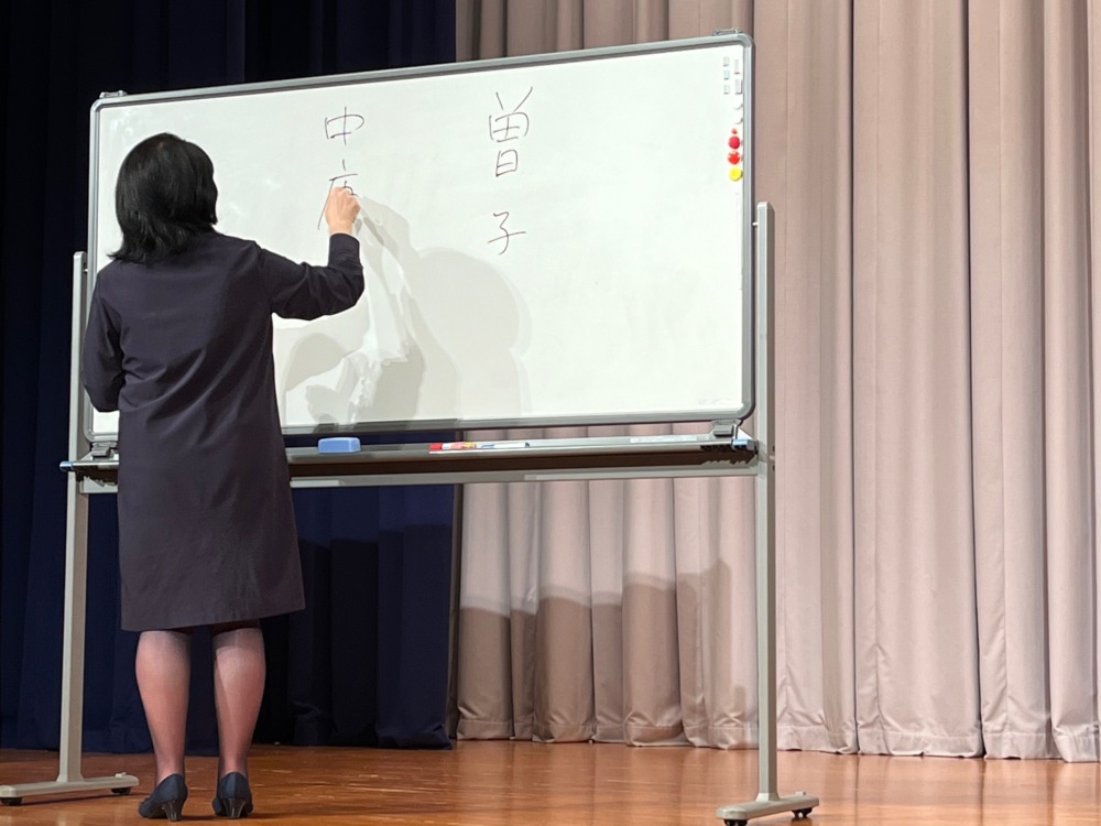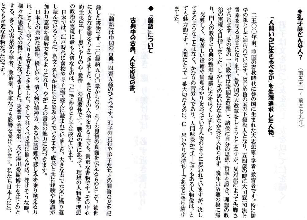 「論語」は2,500年前に、弟子が孔子の教えのうち500を持ち寄り1冊にしたものです。孔子が弟子にリーダーとしてどう対処するかを教えたことをまとめたものです。「聞くことが大切。素読は聞く力をつける。」と、祖父の漢学者安岡正篤氏からの教えを紹介されました。