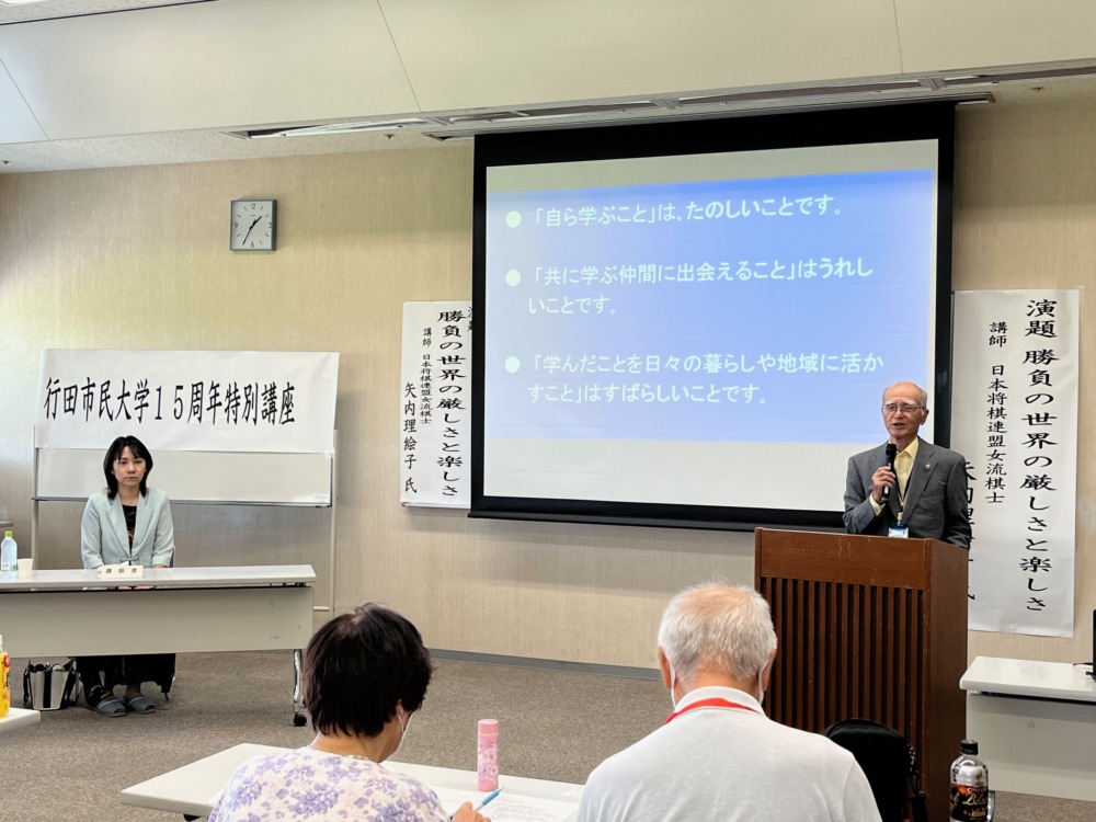 行田市民大学今村武蔵理事長は15周年特別講座をお願いした経緯と第2回さいたま耀き荻野吟子賞の受賞、行田市観光大使第1号であると講師の矢内理絵子女流5段を紹介し挨拶されました。