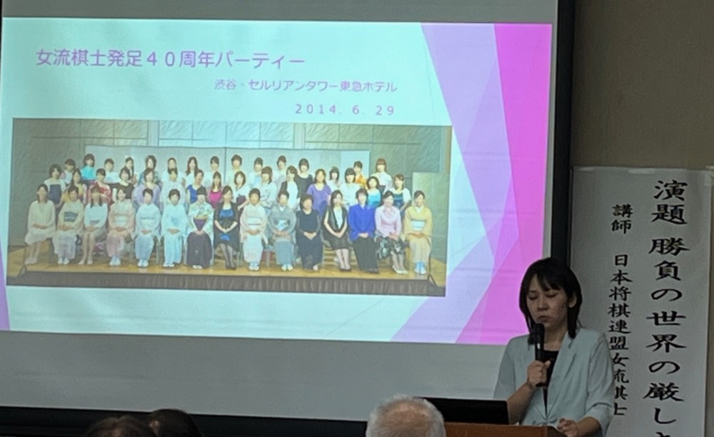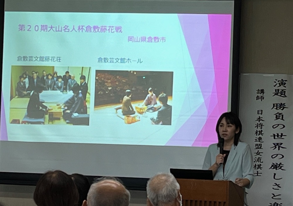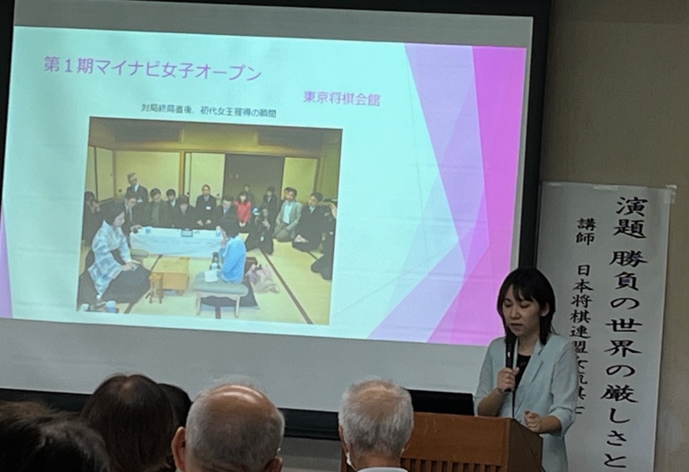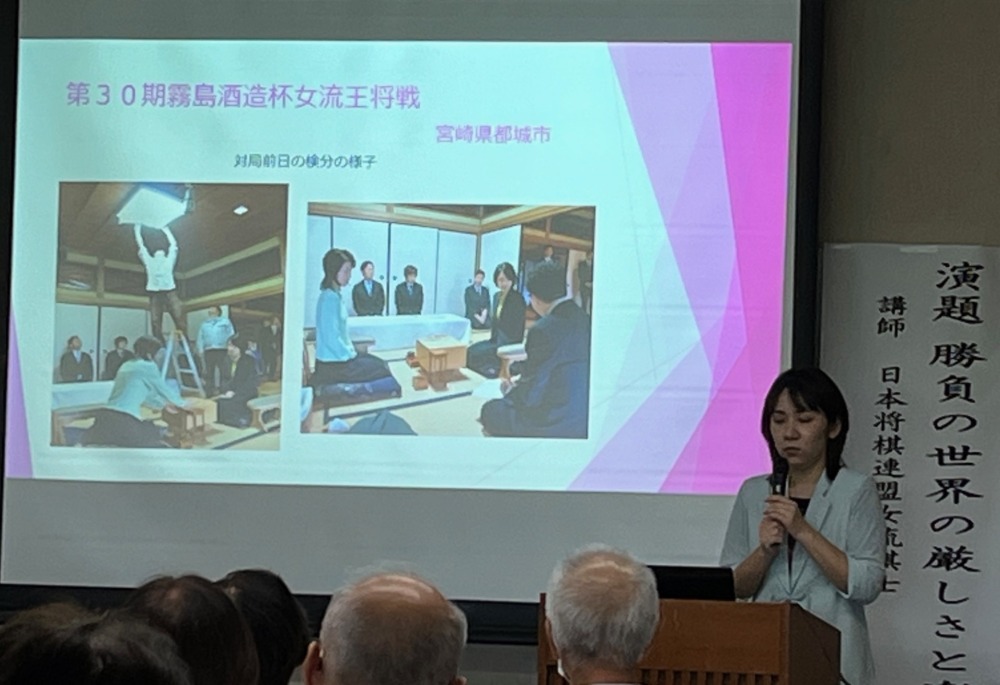 前半は矢内理絵子女流5段の自己紹介と将棋普及活動の取組み、女流棋士界の立ち位置、対局と検分の細かな説明など興味深い内容。
