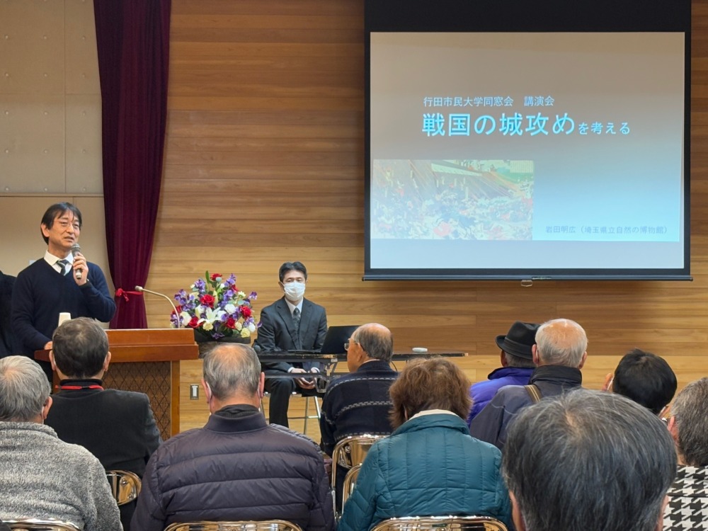 行田市民大学同窓会は令和6年度講演会「戦国の城攻めを考える」を2025年1月23日(木)に忍・行田公民館ホールにて講師に岩田明広氏(埼玉県立自然の博物館副館長)を迎えて開催しました。