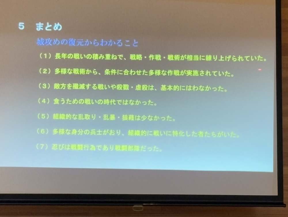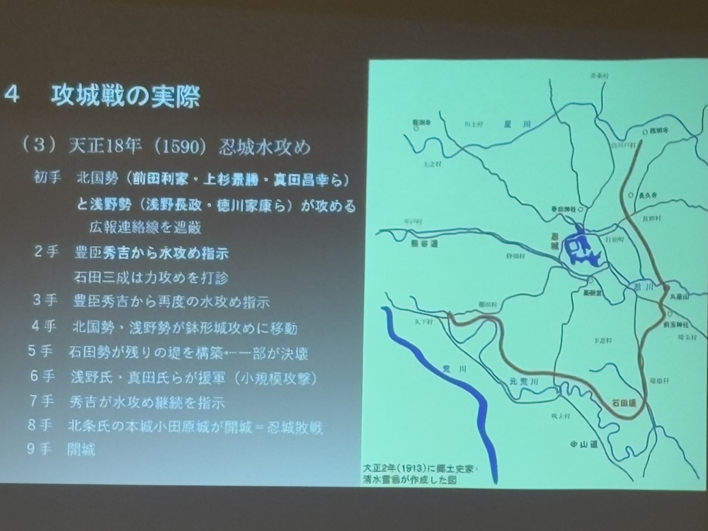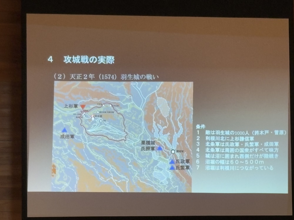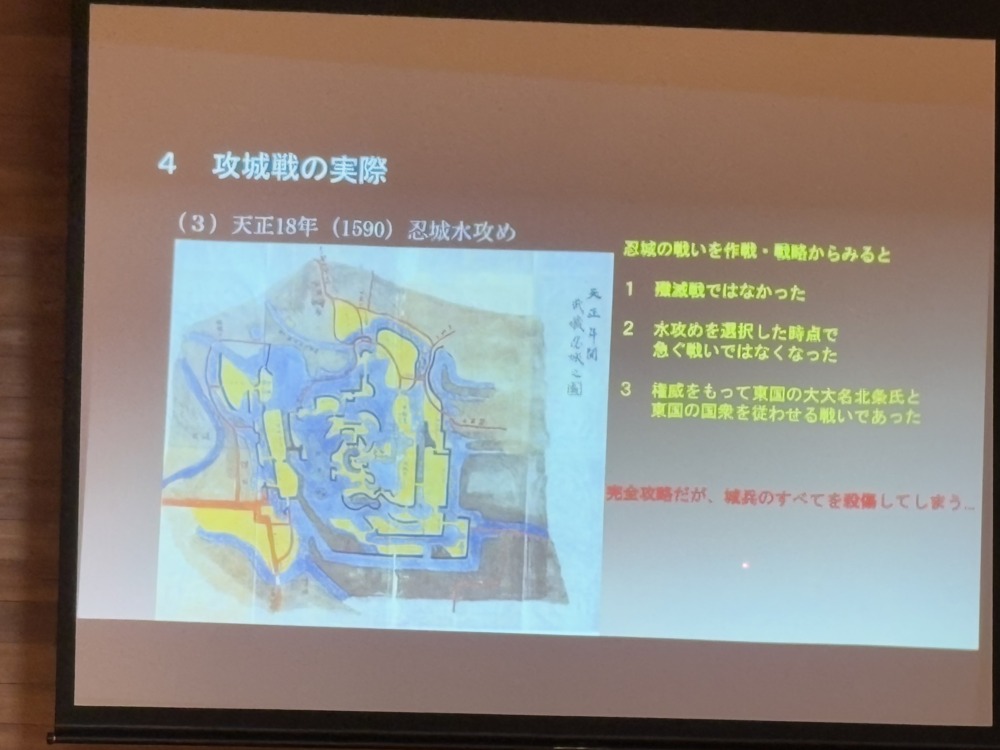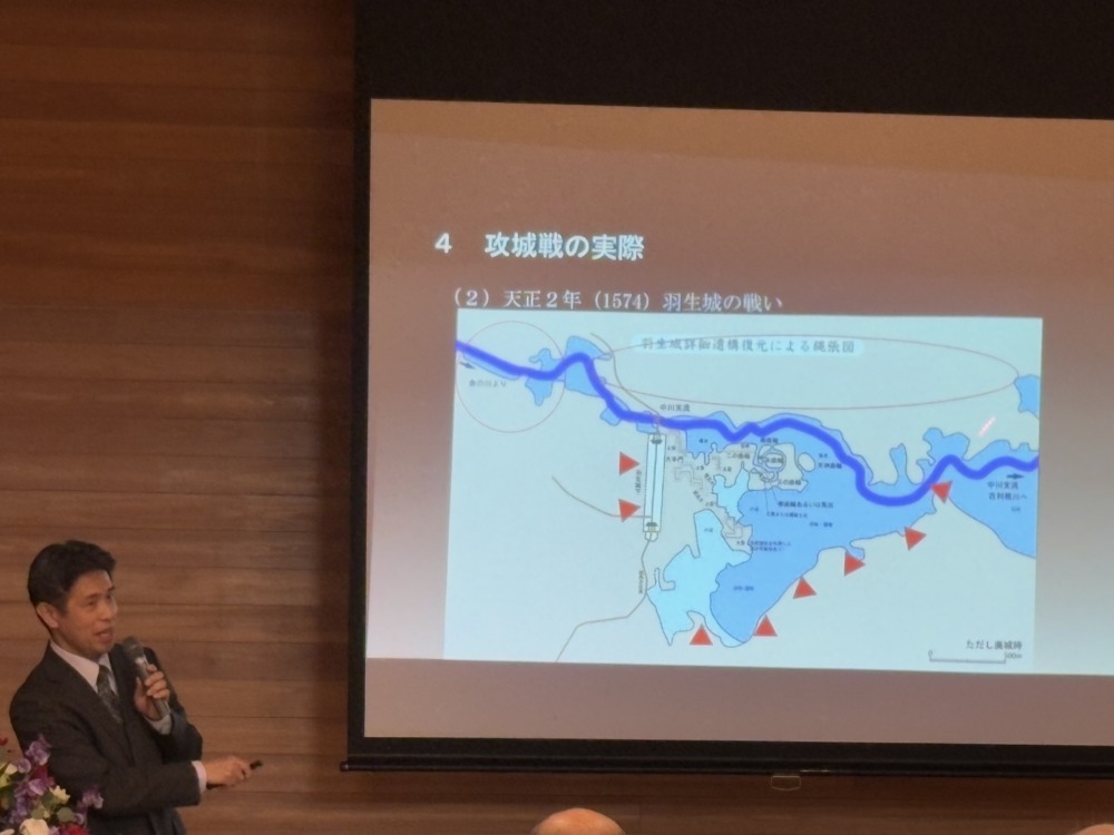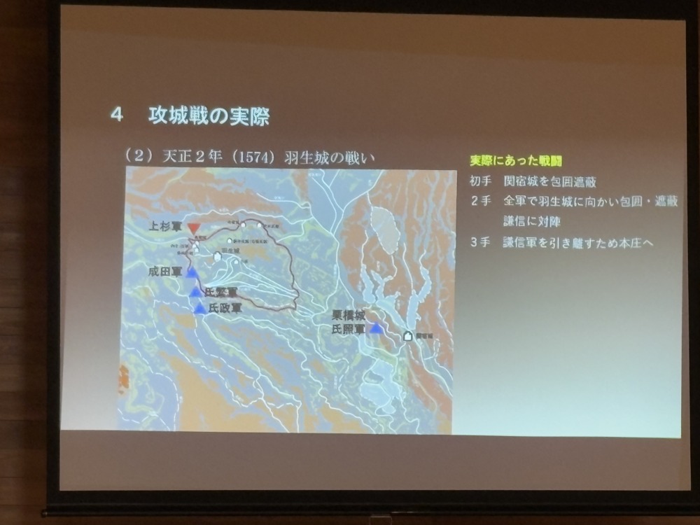 歴史のど真ん中にある「戦国時代」、合戦の舞台「城」の攻城戦における攻勢作戦、守城戦の戦術など「羽生城の戦い」「忍城水攻め」攻防戦の実例を興味深く拝聴いたしました。ありがとうございました。