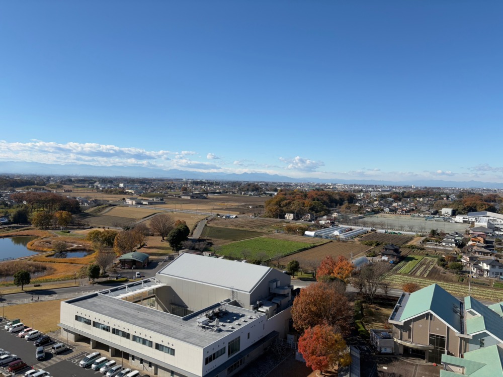 集合場所は行田市総合公園東側駐車場。県道199号線を北に総合福祉会館やすらぎを右に見て利根大橋を渡る。ひたすら北へ国道354号線交差点、狸塚を超えて邑楽町役場の足元に建つシンボルタワー未来MIRAIに昇る。東に筑波山、南に行田タワー、富士山、彩の国くまがやドーム、赤城山、日光連山と360度の眺望を楽しんだ。
