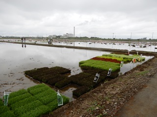 途中に「田んぼアート」横断幕と8種類の品種苗が並べてありました。これを決められた箇所に4~5本づつ升目に30㎝間隔で植えてゆきます。