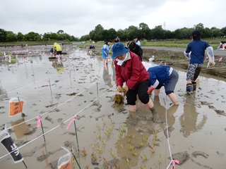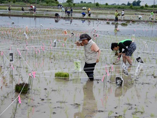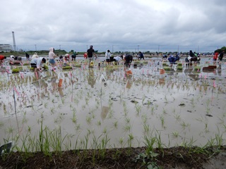 ボランティアの方と協議会委員による総勢約515名の参加者はリピーターも多く、皆さん慣れた手つきで田植えをしていました。また、行田市観光大使のNoeさんも田植えイベントに駆けつけてくださり、ボランティアの方と一緒に田植えをしていただきました。