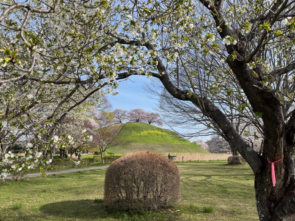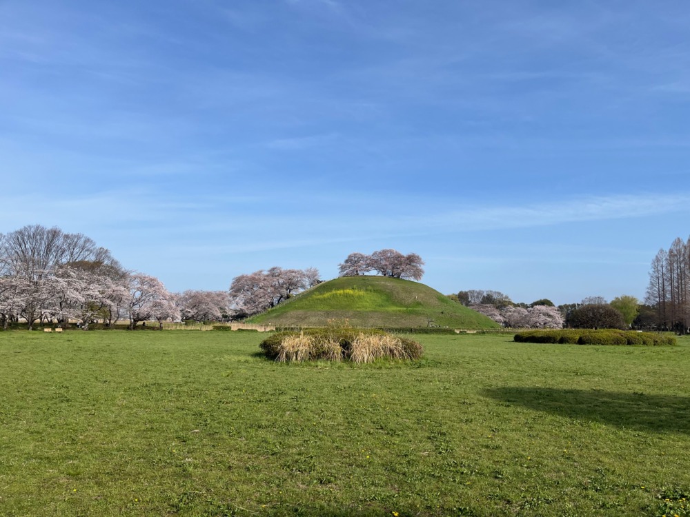 11時に行田市教育文化センターみらい駐車場に集合し、段ボール箱2箱を抱えて桜が待つ会場へ。さきたまテラスを横断してさきたま史跡の博物館入り口信号を渡り一路丸墓山古墳を正面に見て歩くこと10分。花開く桜を頭上に丸墓山古墳、稲荷山古墳を見渡す観桜会のブルーシート席が。登利平の鳥めし弁当、焼き鳥、伊右衛門のペットボトル、箸休めの刻み生姜入りきゅうり浅漬け、食後のデザートにりんご、いちご大福、十万石まんじゅう、などがところ狭しと並ぶ。
