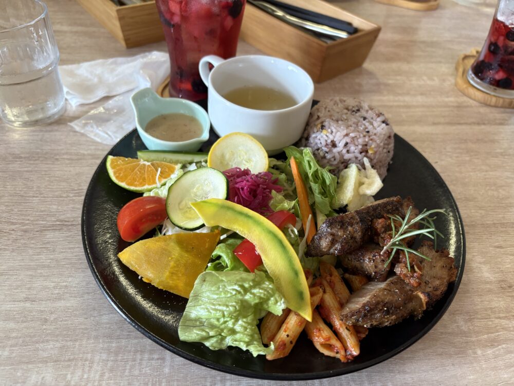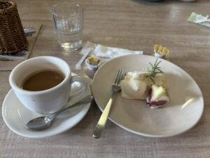 イタリアンのお店で昼食を取る。まずは乾杯。程なく取り合わせが美しく盛られたワンプレートが来る。そして入店の際にショーケースを見て決めた季節のフルーツケーキ・無花果ケーキが来る。コーヒーと共にナイスチョイスだった。