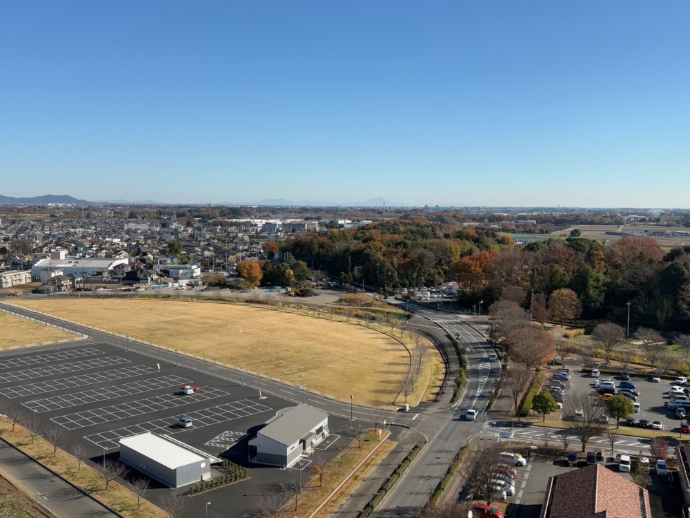 集合場所は行田市総合公園東側駐車場。県道199号線を北に総合福祉会館やすらぎを右に見て利根大橋を渡る。ひたすら北へ国道354号線交差点、狸塚を超えて邑楽町役場の足元に建つシンボルタワー未来MIRAIに昇る。東に筑波山、南に行田タワー、富士山、彩の国くまがやドーム、赤城山、日光連山と360度の眺望を楽しんだ。