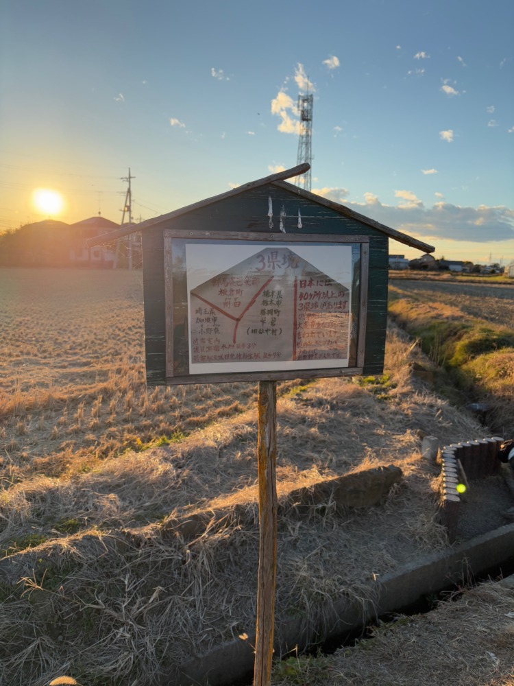 北エントランスを出て県道佐野・古河線を谷田川に沿って南へ進み、道の駅かぞわたらせを左に見てぐるっと回りこみ少し進むと三県境があります。田圃の境の境界柱といった感じです。全国を見ても珍しい平地の県境です。埼玉県・群馬県・栃木県の三県を一点で訪問した旅でした。今度は緑の季節に訪れたいと思います。