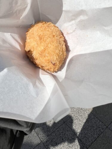 途中、お肉屋さんでラグビーボールの形をしたコロッケに舌鼓。