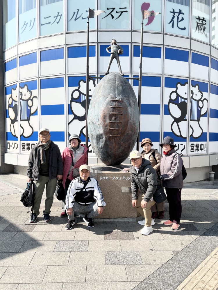 ラグビーの街らしく、旧丸井デパートの脇に金属製の巨大ラグビーボール。ボールを囲んでポーズ。