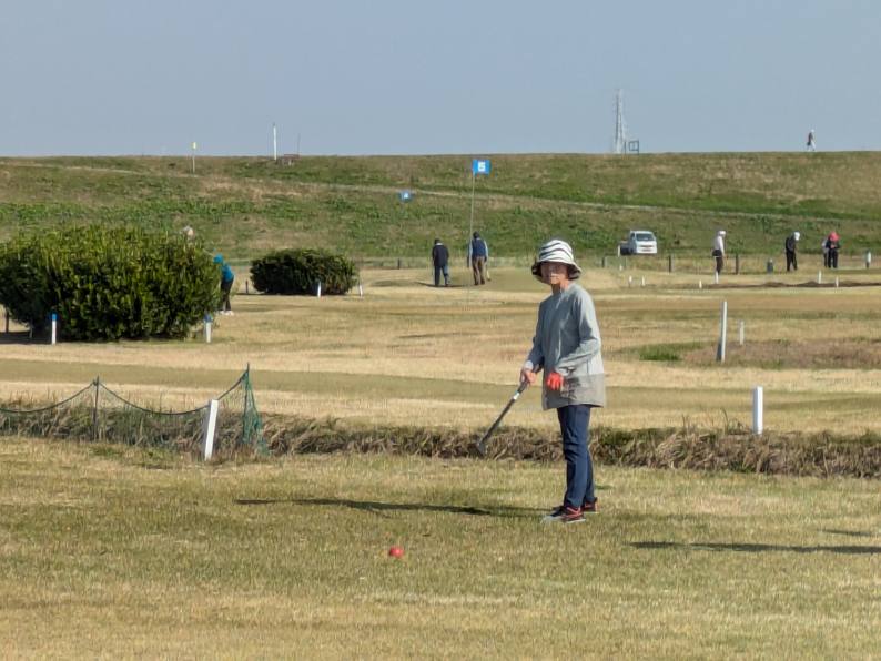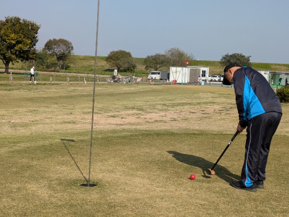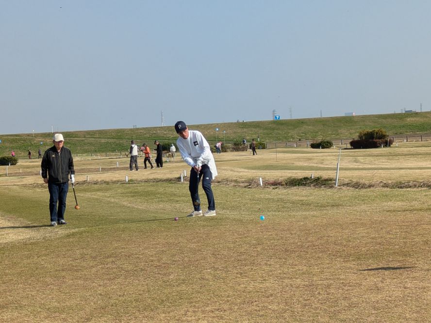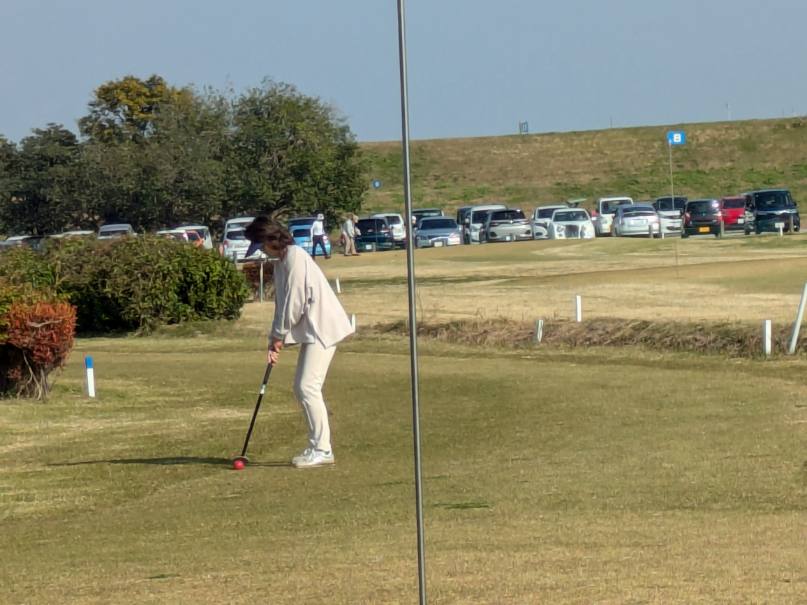 河川敷のパークゴルフ場でプレーを楽しむ学生さん達はこんな中、笑顔でボールを打ったり、パットをしたり!!楽しい時間を過ごしました。