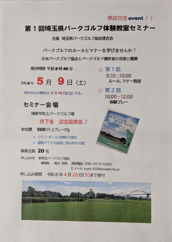 来る5月9日(土)、埼玉県パークゴルフ協会連合会主催による第1回埼玉県パークゴルフ体験セミナー