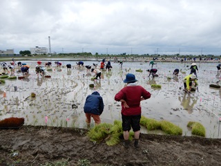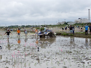 ボランティアの方と協議会委員による総勢約515名の参加者はリピーターも多く、皆さん慣れた手つきで田植えをしていました。また、行田市観光大使のNoeさんも田植えイベントに駆けつけてくださり、ボランティアの方と一緒に田植えをしていただきました。